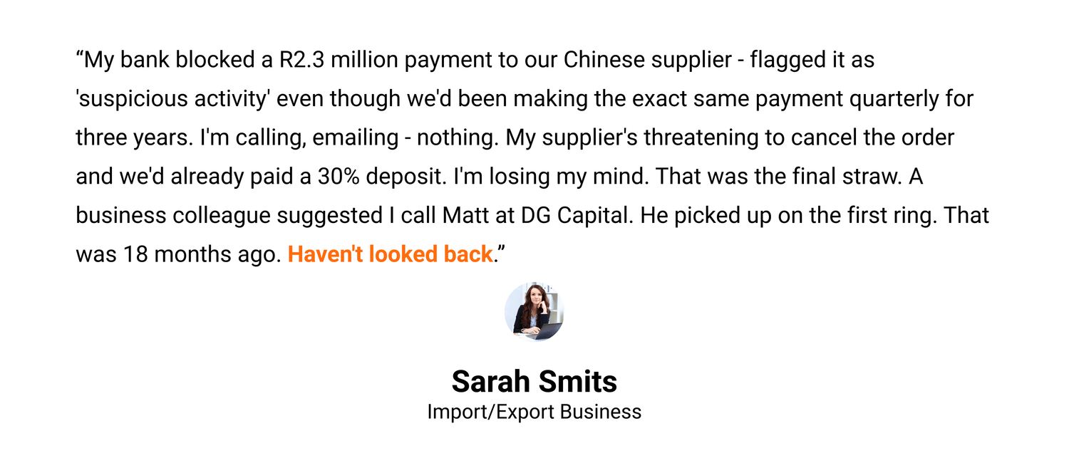 Order stock today at R17 to the dollar, pay in 60 days. Even if the Rand hits R18.50, you're protected. Book today's rate for tomorrow's payment.